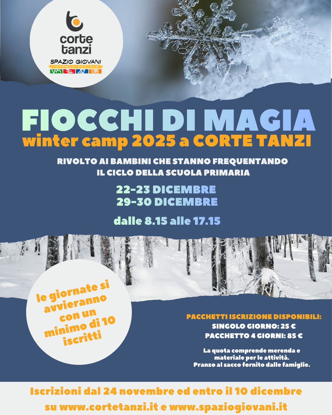 Nei giorni 22, 23, 29 e 30 dicembre a Corte Tanzi si terrà il winter camp di Spazio Giovani rivolto a bambine e bambini che stanno frequentando la scuola Primaria. Sarà possibile iscriversi ad una singola giornata oppure all’intero percorso, con avvio a scelta dal 22 o dal 23 dicembre.